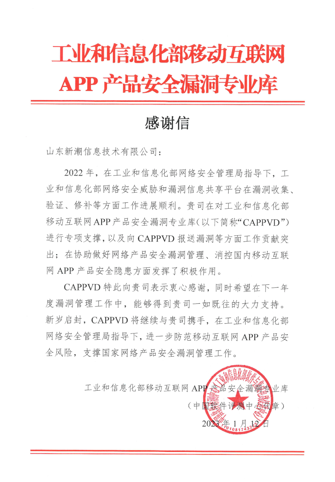 近日,工業和信息化部移動互聯網APP產品安全漏洞專業庫(以下簡稱“CAPPVD漏洞庫”)向山東新潮信息技術有限公司發來感謝信,這是對山東新潮信息參與移動互聯網APP產品安全漏洞管理系列工作的高度認可與感謝,并期望在下一年共同攜手支撐國家網絡產品安全漏洞管理工作。