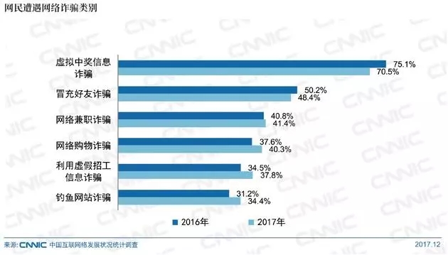 通過對2017年遭遇網上詐騙的用戶進一步調查發現,虛擬中獎信息詐騙依然是受眾最為廣泛的網上詐騙類型,在遭遇網絡詐騙的用戶中占比達到70.5%;其次為利用社交軟件冒充好友進行詐騙,在遭遇網絡詐騙用戶中的占比為48.4%。但這兩類詐騙行為在所有遭遇網上詐騙的用戶中的占比均較2016年有所下降。此外,在遭遇網上詐騙的用戶中,遇到網絡兼職詐騙、網絡購物詐騙、虛假招聘信息詐騙、釣魚網站詐騙的用戶占比較2016年均略有升高。