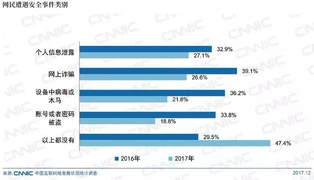 2017年我國網民在上網過程中遇到安全問題的比例明顯下降。數據顯示,高達47.4%的網民表示在過去半年中并未遇到過任何網絡安全問題,較2016年提升17.9個百分點。通過對用戶遭遇的網絡安全問題進行區分可以發現,各類網絡安全事件發生的比例均較2016年明顯下降。其中,遭遇個人信息泄露問題占比最高,達到27.1%,但依然相比2016年下降5.7個百分點;遭遇賬號或密碼被盜的網民占比僅為18.8%,較2016年下降最多。