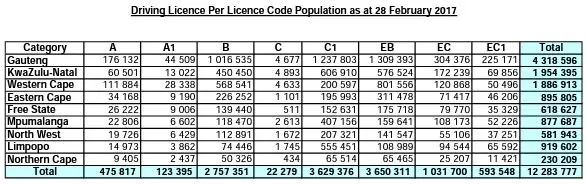 南非 eNATIS 駕照人數統計(2017 年 3 月)
